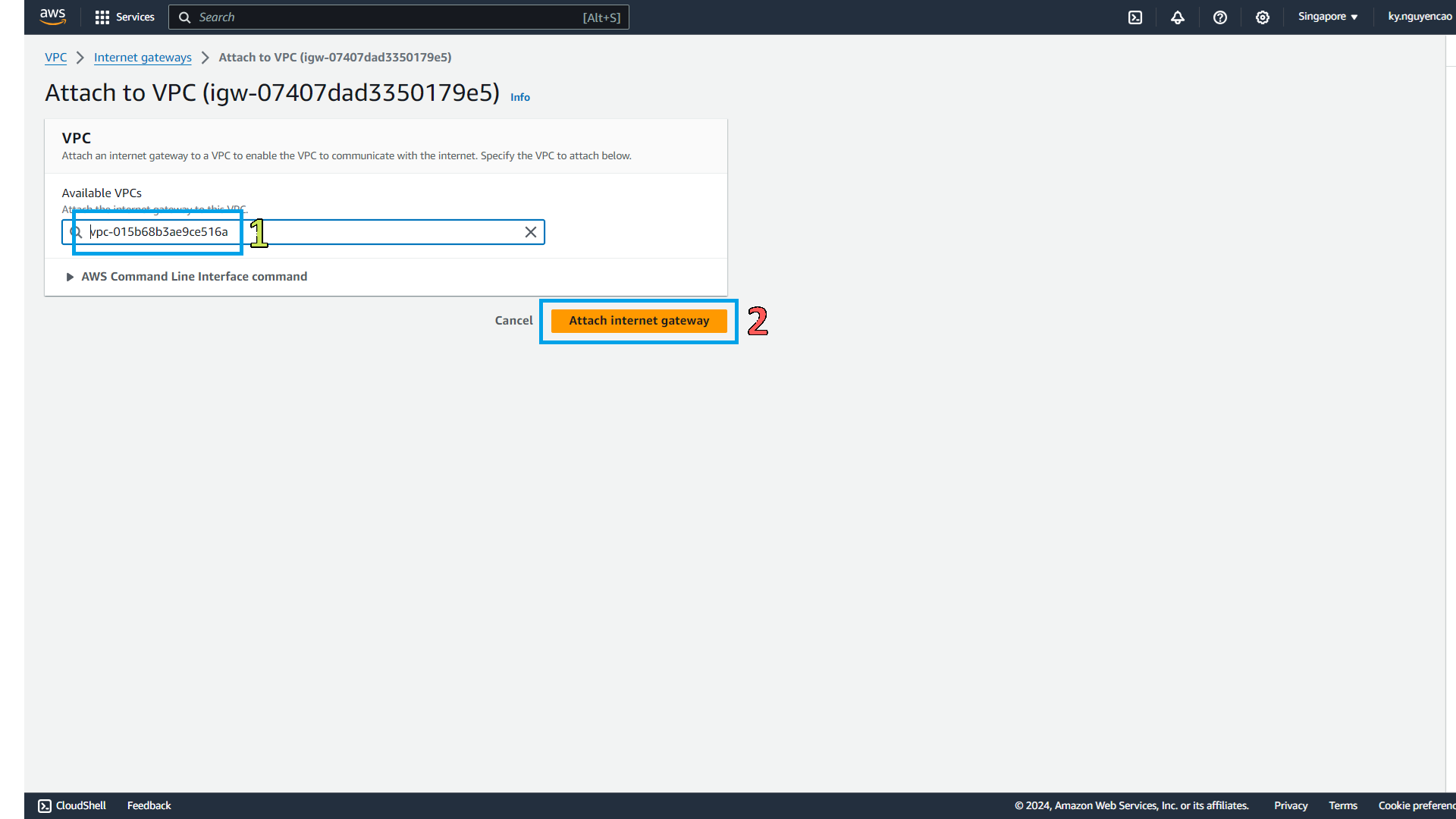 - In the Attach to VPC dialog box, choose the VPC with tag