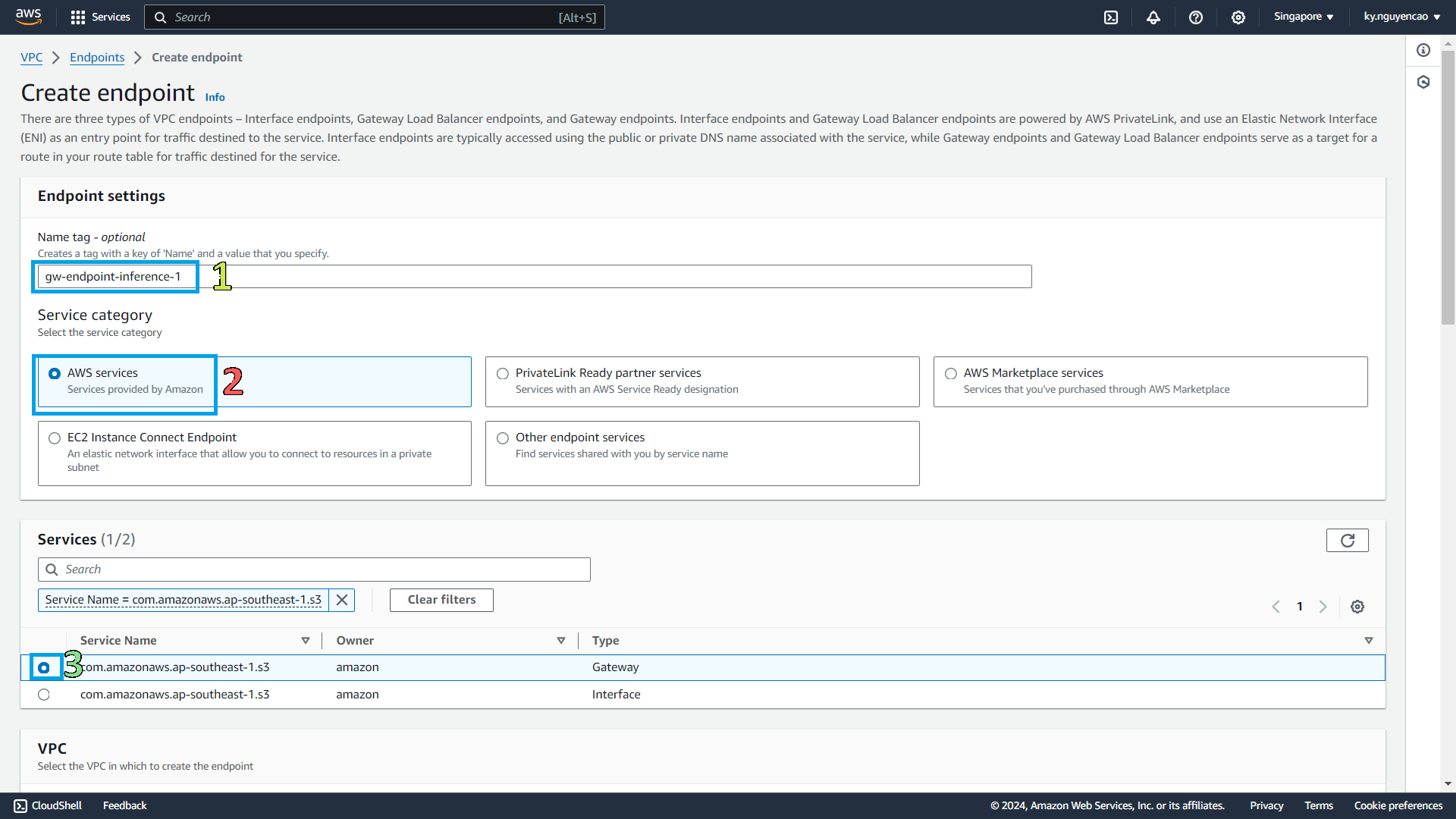 com.amazonaws.ap-southeast-1.s3ofGatewaytype. - VPC:
